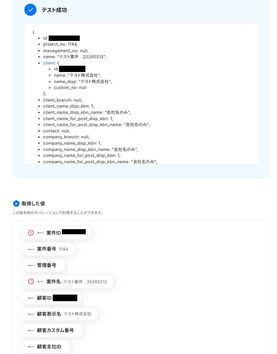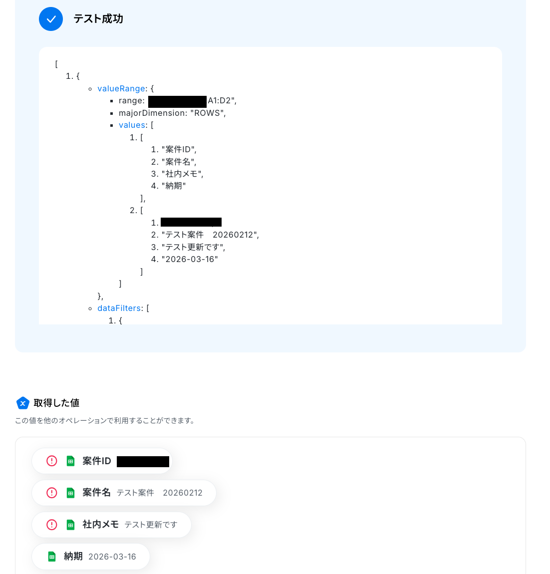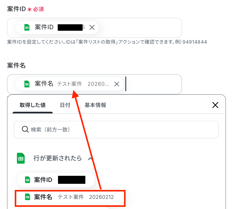 「案件ID」・「案件名」は、Google スプレッドシートのトリガー設定で取得した値を引用して設定してください。