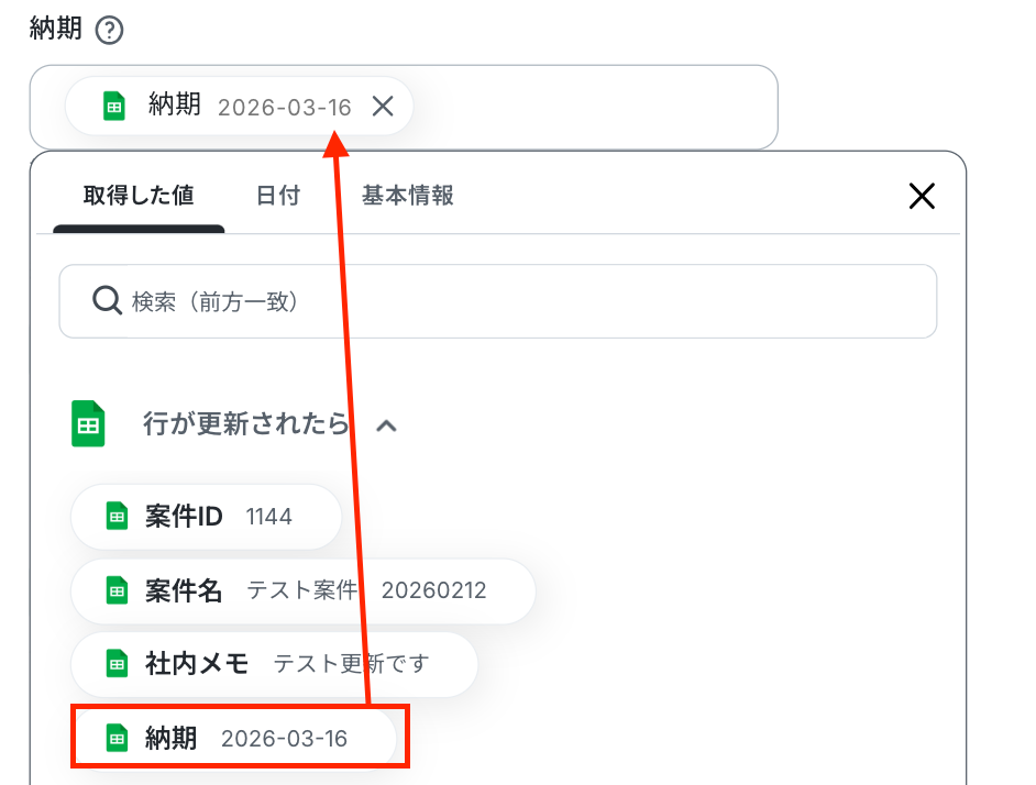 「納期」と「社内メモ」も同様に、Google スプレッドシートのトリガー設定で取得した値を引用して設定してください。