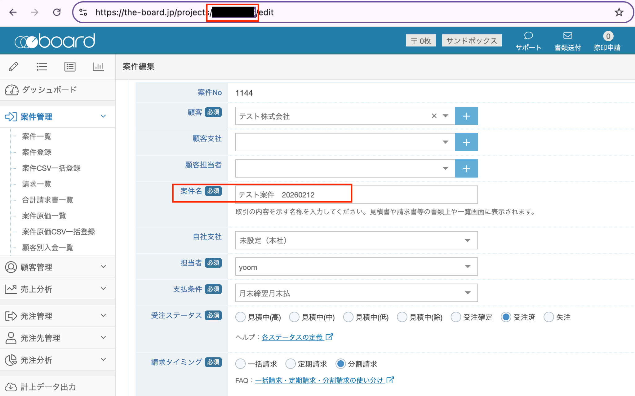 最後にboardの画面で分割請求の案件が更新されたか確認してください。