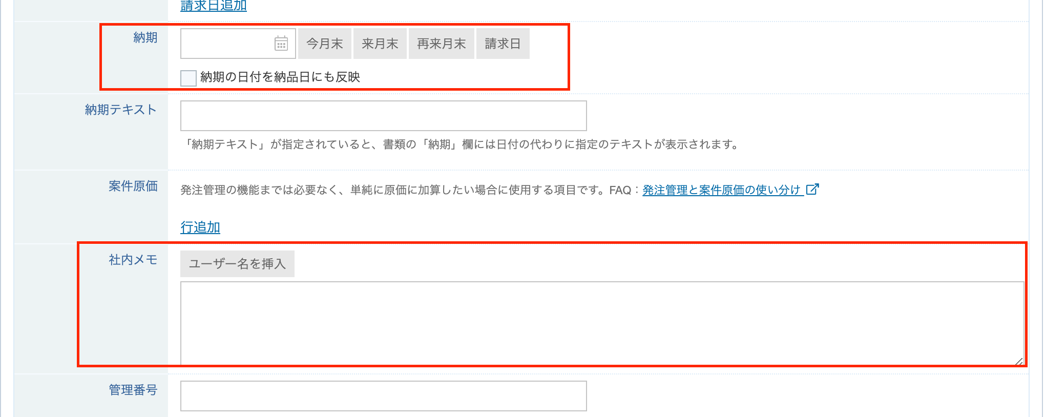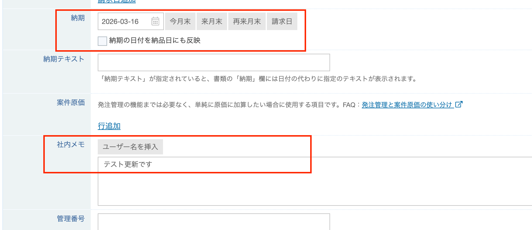 今回は、以下の「社内メモ」と「納期」を更新する想定です。