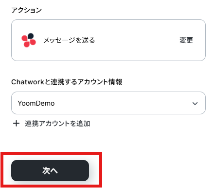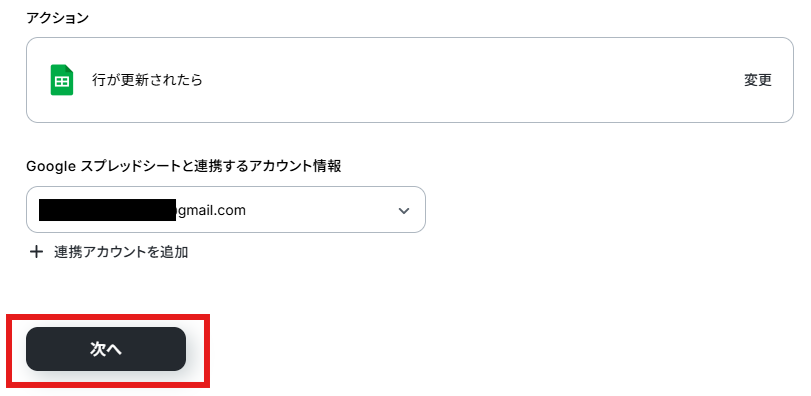 アクションはデフォルト設定のまま、アカウント情報は、連携したいアカウントが選択されているか確認してください。確認出来たら「次へ」をクリックしましょう。