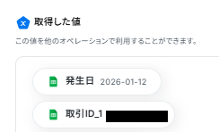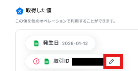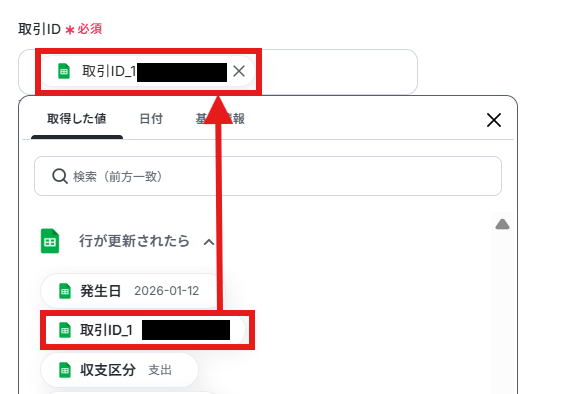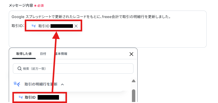 取引IDを取得した値から入力します。 取得した値を活用することで、固定値ではなく、トリガーが実行されるたびに最新の情報が反映できます。