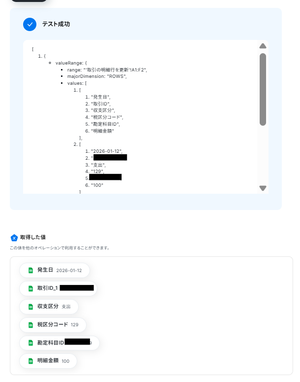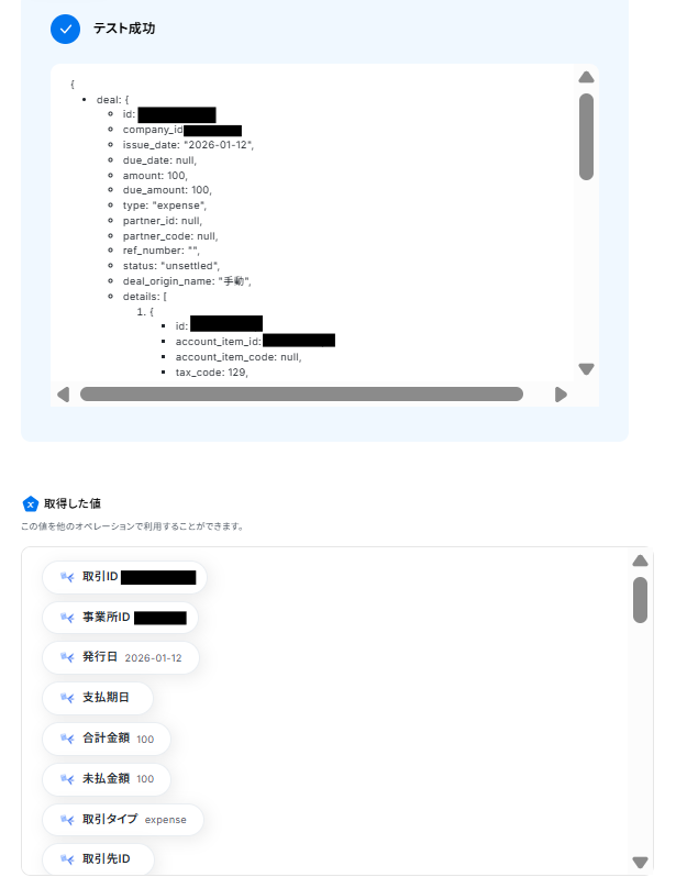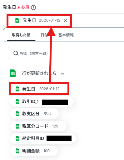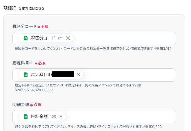 「発生日」、「税区分コード」、「勘定科目ID」、「明細金額」は前ステップの取得した値からそれぞれ対応するものを入力していきます。