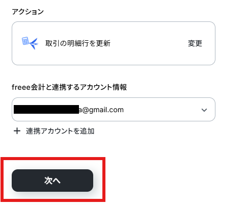 アクションはデフォルト設定のまま、アカウント情報は、連携したいアカウントが選択されているか確認してください。確認が終わったら「次へ」で進みましょう。