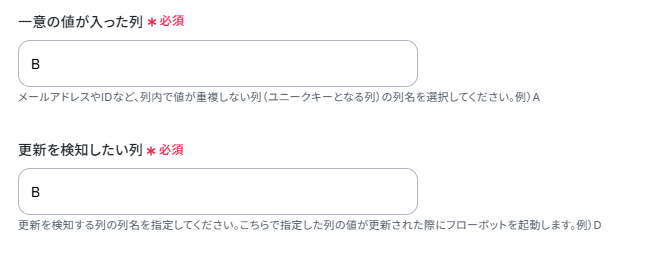 「一意の値が入った列」は他と重複しない値が入った列としてBを、「更新を検知したい列」もBとしています。