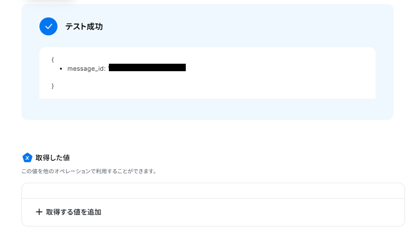 「メッセージ内容」はデフォルト設定の値をそのまま使用しました。 取得した値も使えますので、わかりやすく入力しましょう。