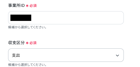 事業所ID、収支区分は候補に表示されますので、そちらから入力します。