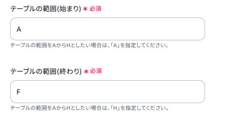 「テーブル範囲の始まり・終わり」はGoogle スプレッドシート上で値が入っている範囲を指定します。