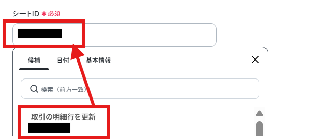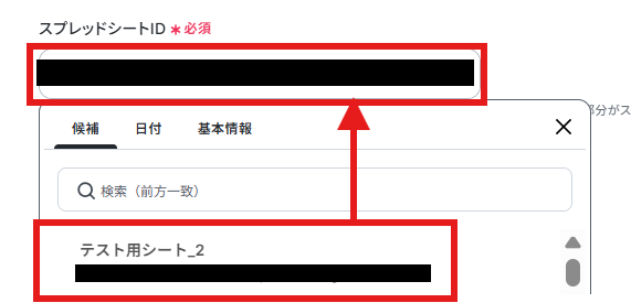 上記で作成した「スプレッドシートID」を候補から入力していきます。
