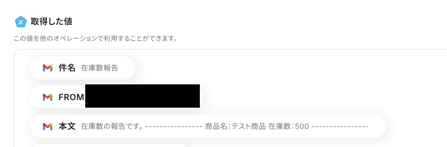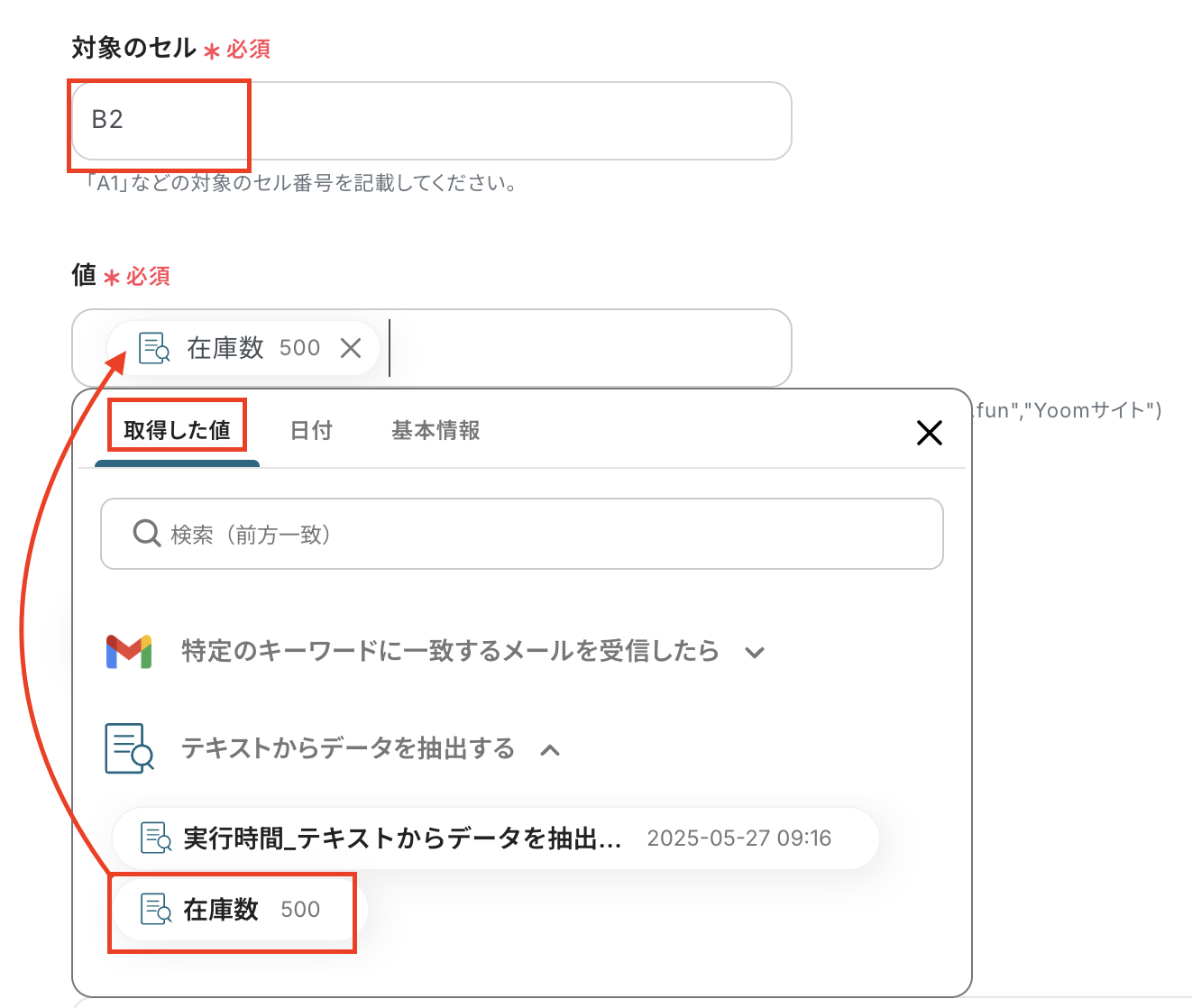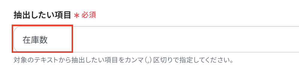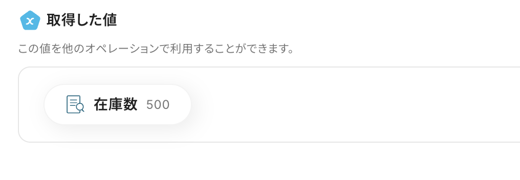 値は、テキストからデータを抽出の取得した値から「在庫数」を選択しましょう。