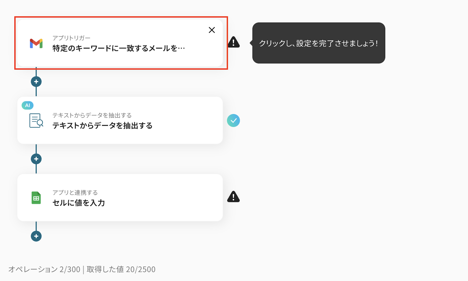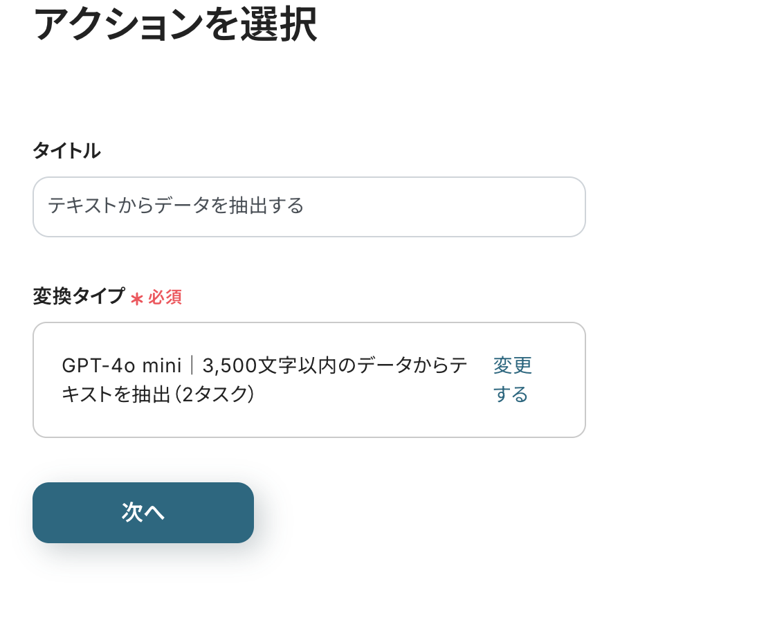 アクションは「3500文字以内のデータからテキストを抽出」が選択されていますが、文字数に応じて変更してください。