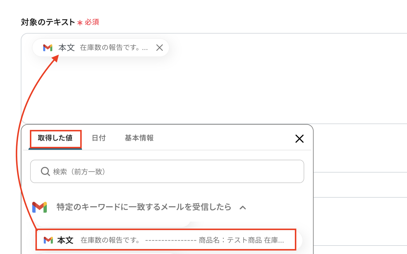 対象のテキストはGmailのトリガーの取得した値から「本文」を選択します。