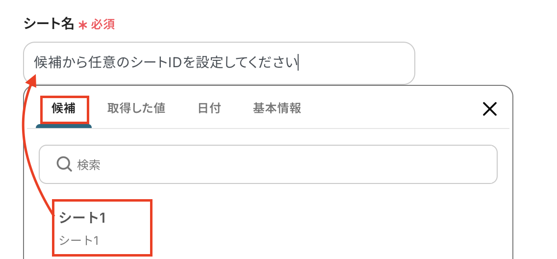 シート名も同様に候補から選択してください。