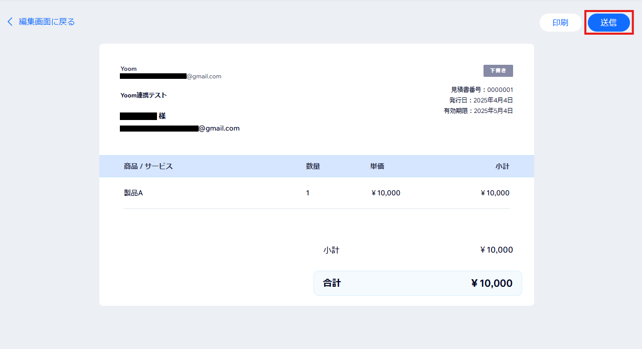 - テスト用の見積書を作成し、「送信」をクリック。