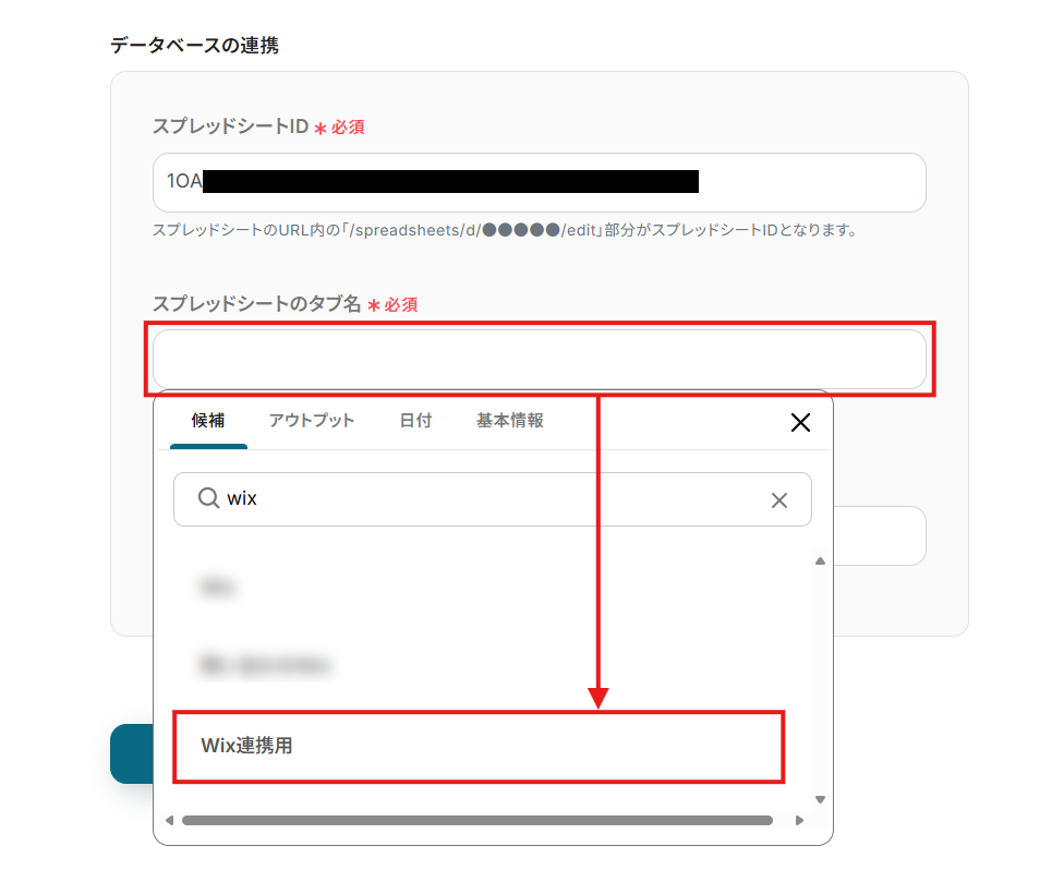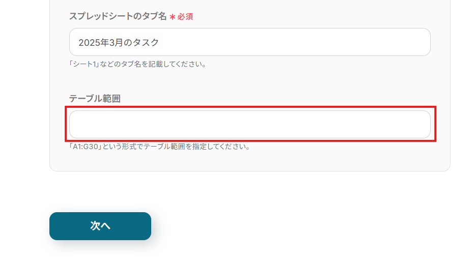 - 「スプレッドシートのタブ名」に対象となるタブ(シート)を選択。