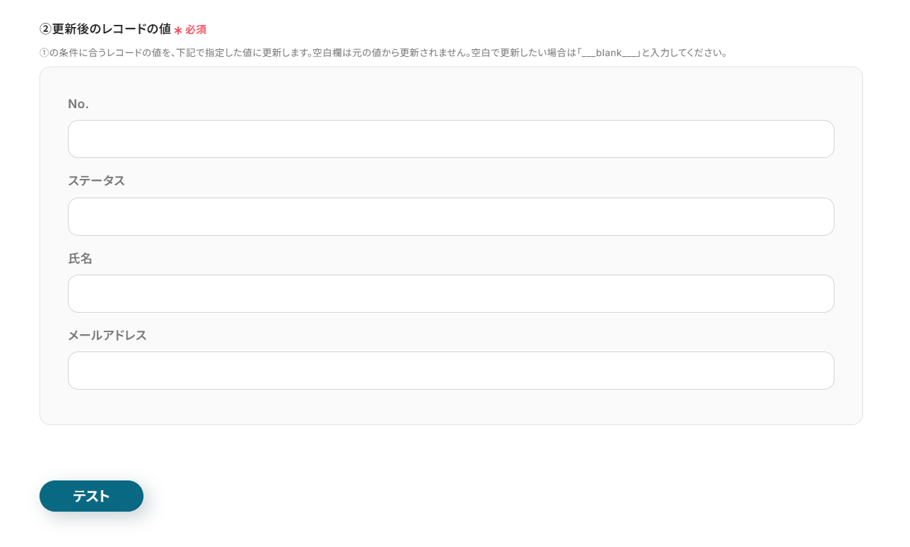 - 更新後のレコードの値を、それぞれ任意の値で設定。