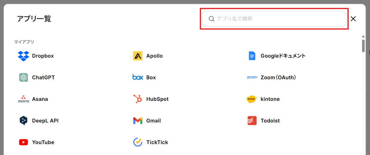 - 「アプリ一覧」が表示されたら、右上の検索バーでアプリ名を検索して選択。
