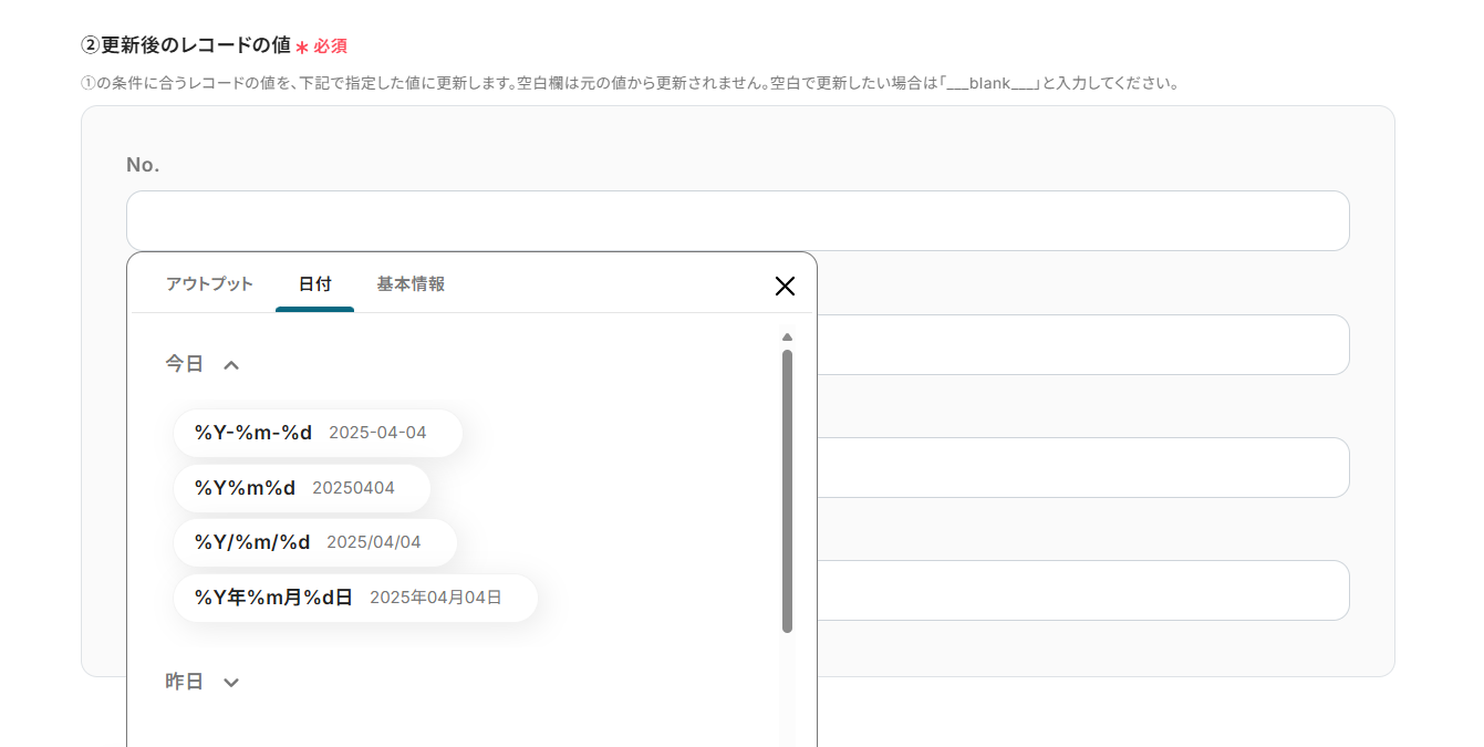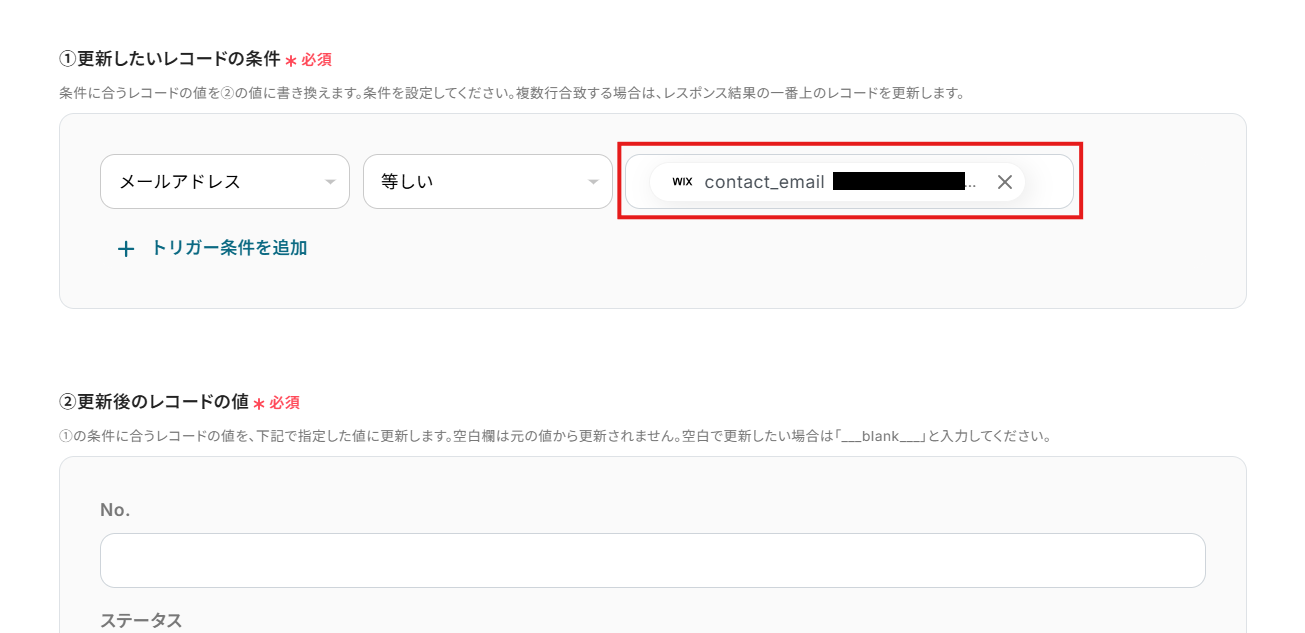 - 更新したいレコードの条件を、任意の条件で設定。