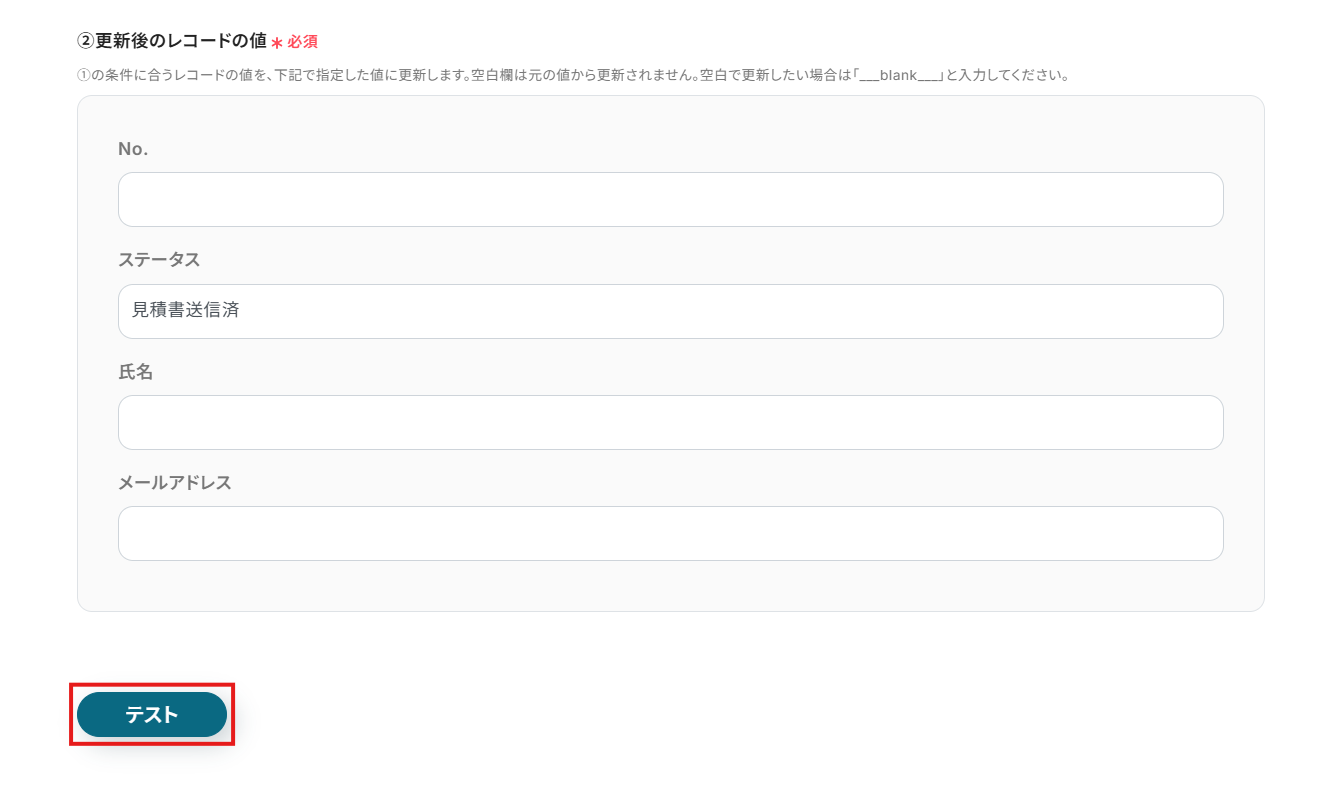 ここでは例として、「ステータス」のみ「見積書送信済」に更新するよう設定します。