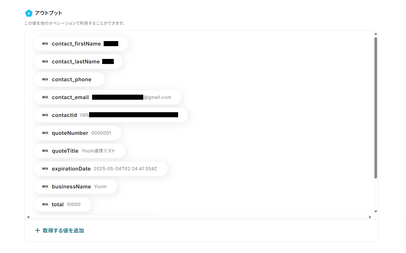 テストに成功すると、「アウトプット」に送信した見積書のデータが追加されます。