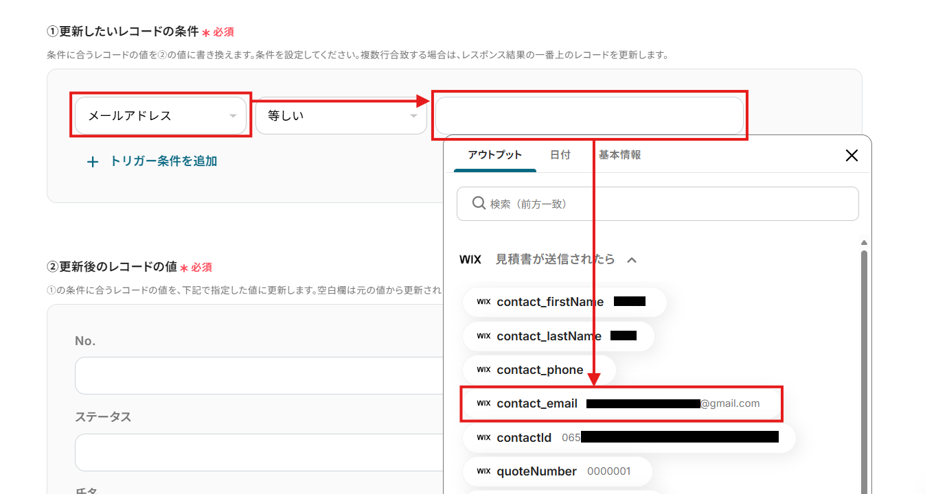 ここでは例として、「メールアドレス」が見積書のデータと一致するレコードを更新するよう設定します。