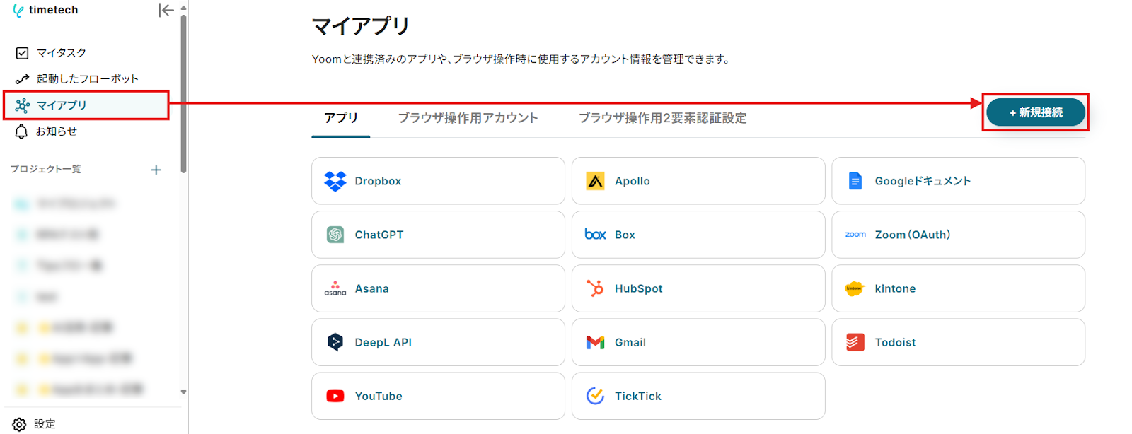 - マイアプリ画面の右側にある「+新規接続」をクリック。
