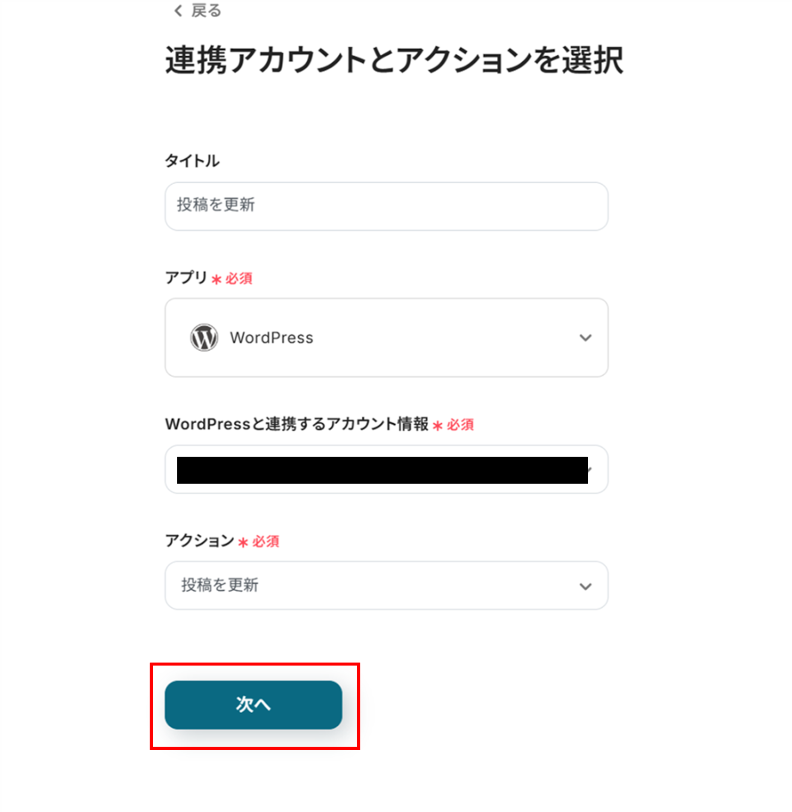 (2)WordPressの「連携アカウントとアクションを選択」画面から、WordPressと連携するアカウント情報に誤りがないかを確認し、アクションは「投稿を更新」のままで「次へ」をクリックします。