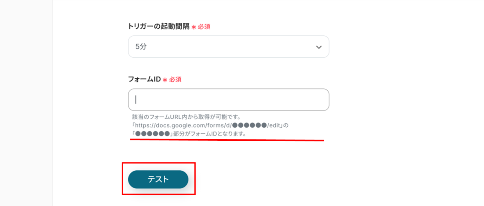 入力が完了したら、対象のGoogleフォームにテストとして回答を送信後にYoomに戻り「テスト」をクリックしましょう。