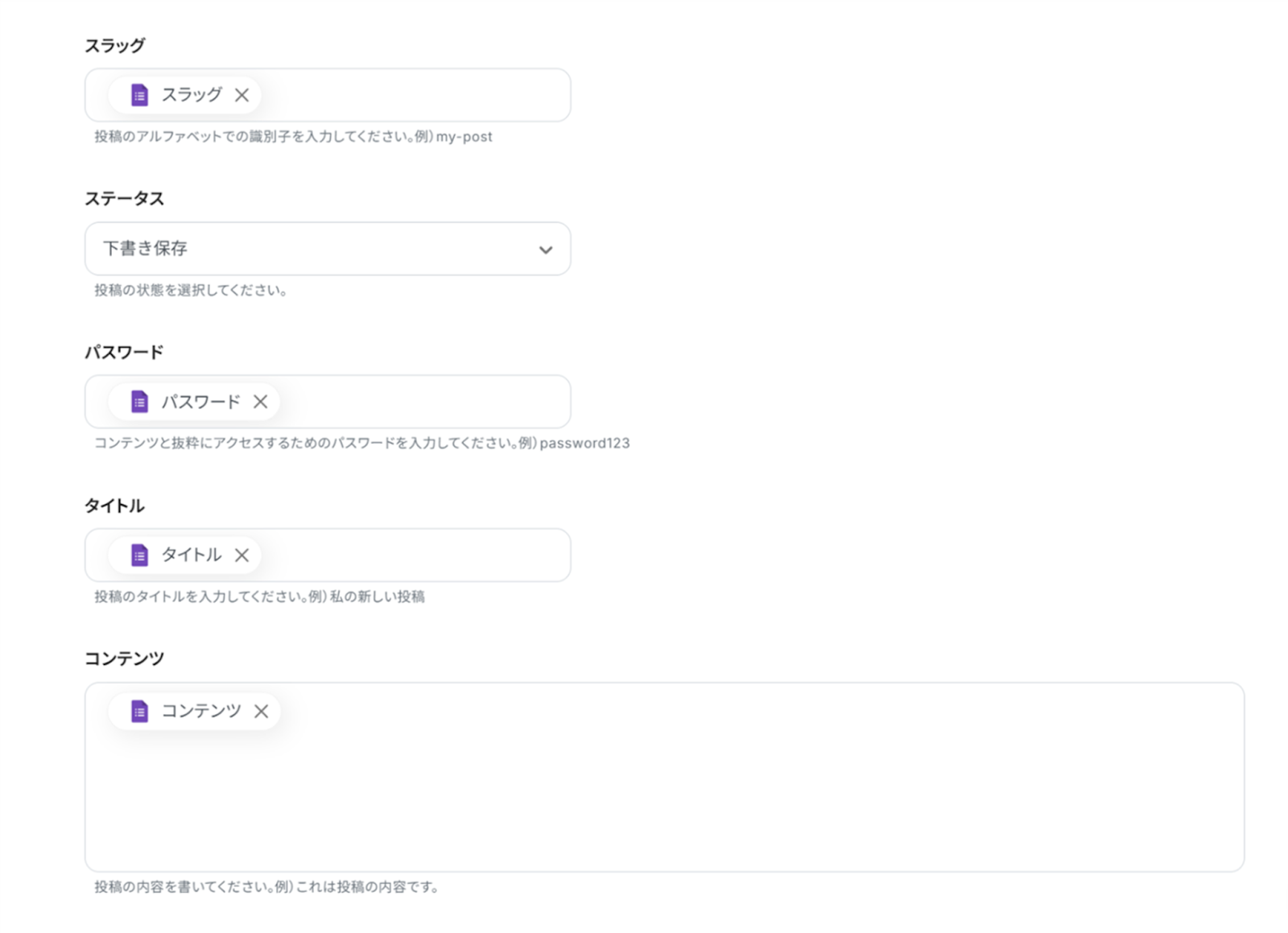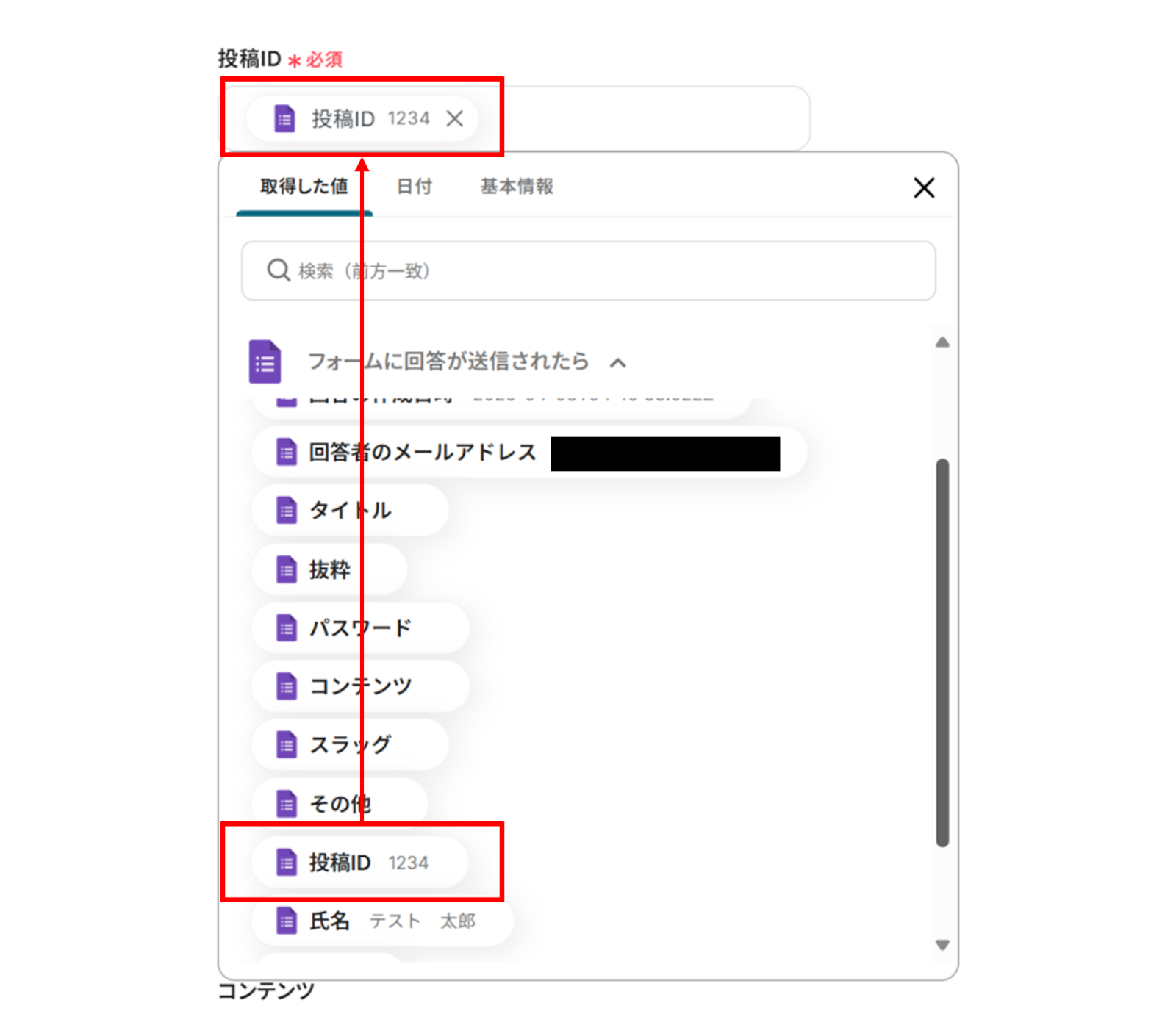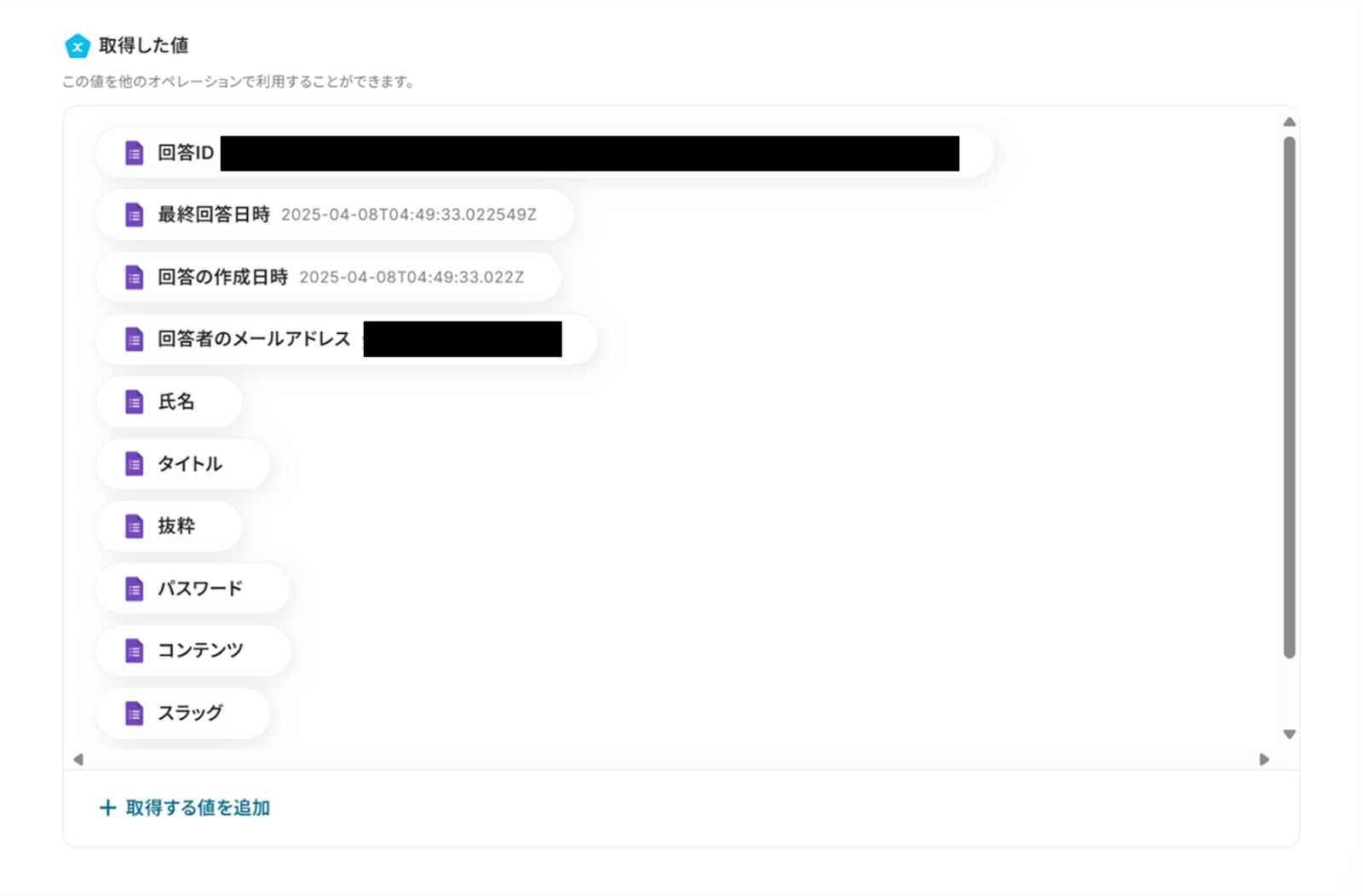 その他の項目は必須項目ではありませんが、必要な項目に「取得した値」を使って入力していきましょう!