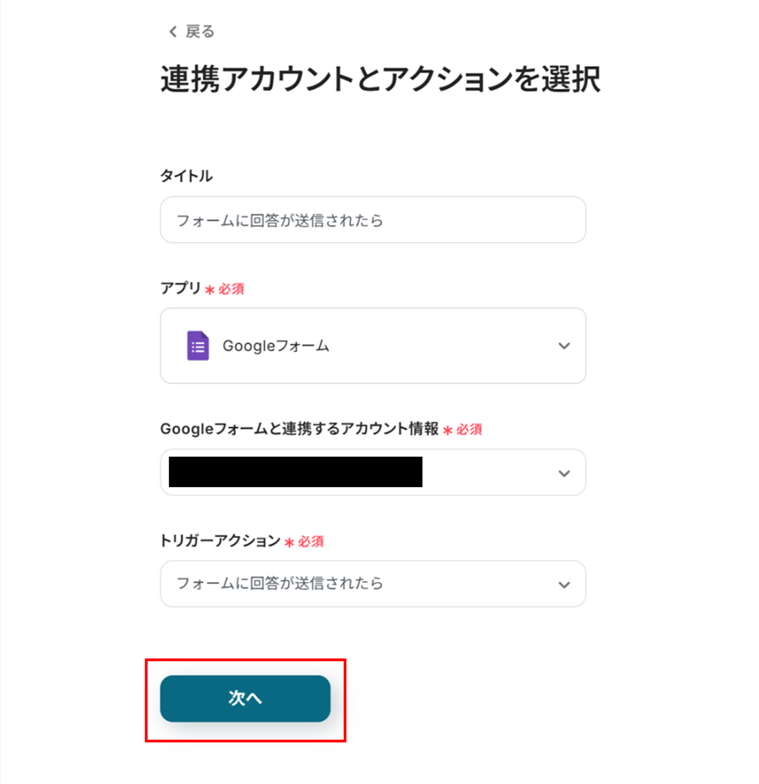 (2)Googleフォームの「連携アカウントとアクションを選択」画面から、Googleフォームと連携するアカウント情報に誤りがないかを確認し、トリガーアクションは「フォームに回答が送信されたら」のままで「次へ」をクリックします。