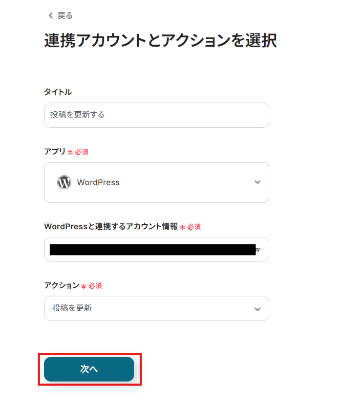 連携するアカウント情報には、ステップ1で連携したアカウント情報が反映されています。トリガーアクションはそのままにして、「次へ」をクリックしてください。