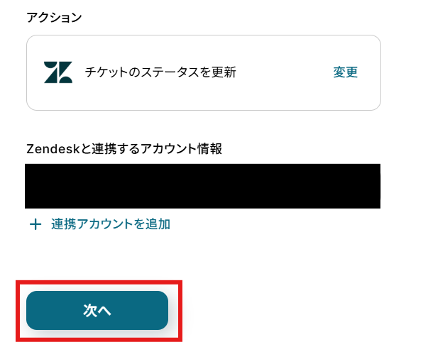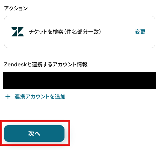 「アクション」はテンプレート通りのままでOKです! 「Zendeskと連携するアカウント情報」を確認し、「次へ」をクリックして進んでください。