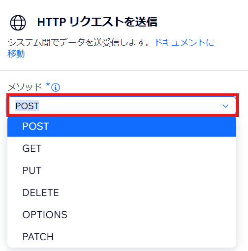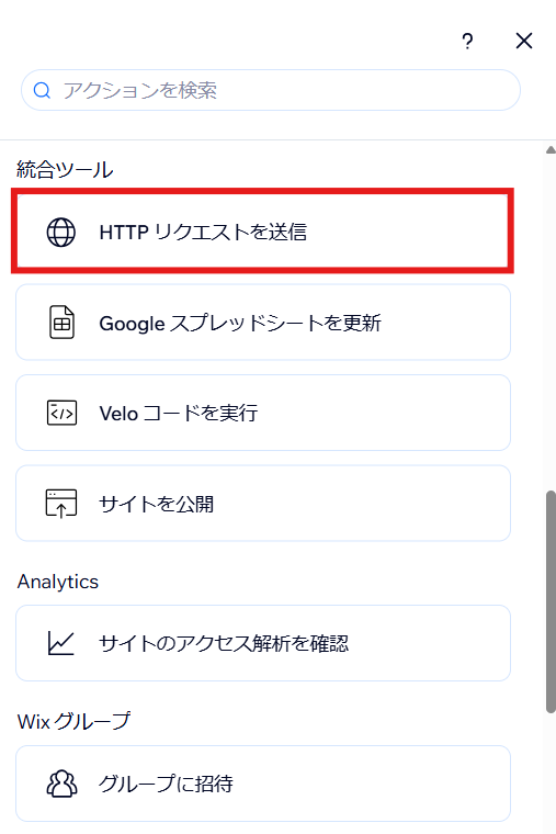 「アクション」をクリックし、「HTTPリクエストを送信」を選択します。