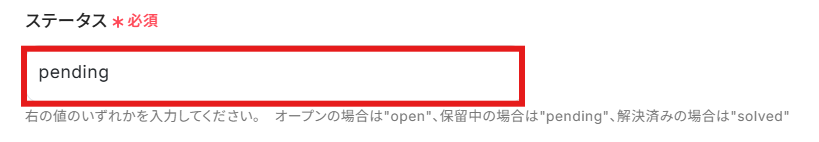 注釈に沿って「ステータス」を任意のものに設定しましょう。 今回は「pending」に設定しています。