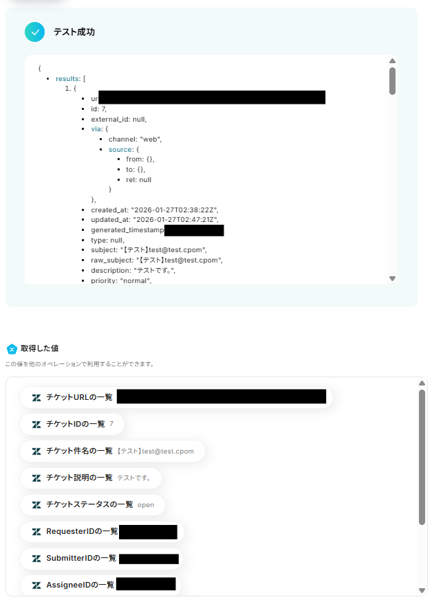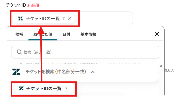 「チケットID」を「取得した値」から設定しましょう。