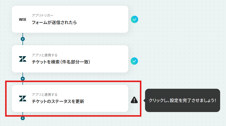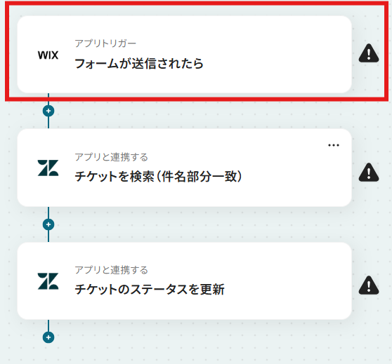 はじめに、WixとZendeskをYoomと連携します 次に、トリガーでWixを選択し、「フォームが送信されたら」というアクションを設定します その後、オペレーションでZendeskの「チケットを検索(件名部分一致)」アクションを設定し、Wixフォームから送信された情報をもとに該当チケットを検索します 最後に、Zendeskの「チケットのステータスを更新」アクションを設定し、検索で見つかったチケットのステータスを更新します ※「トリガー」:フロー起動のきっかけとなるアクション、「オペレーション」:トリガー起動後、フロー内で処理を行うアクション■このワークフローのカスタムポイント