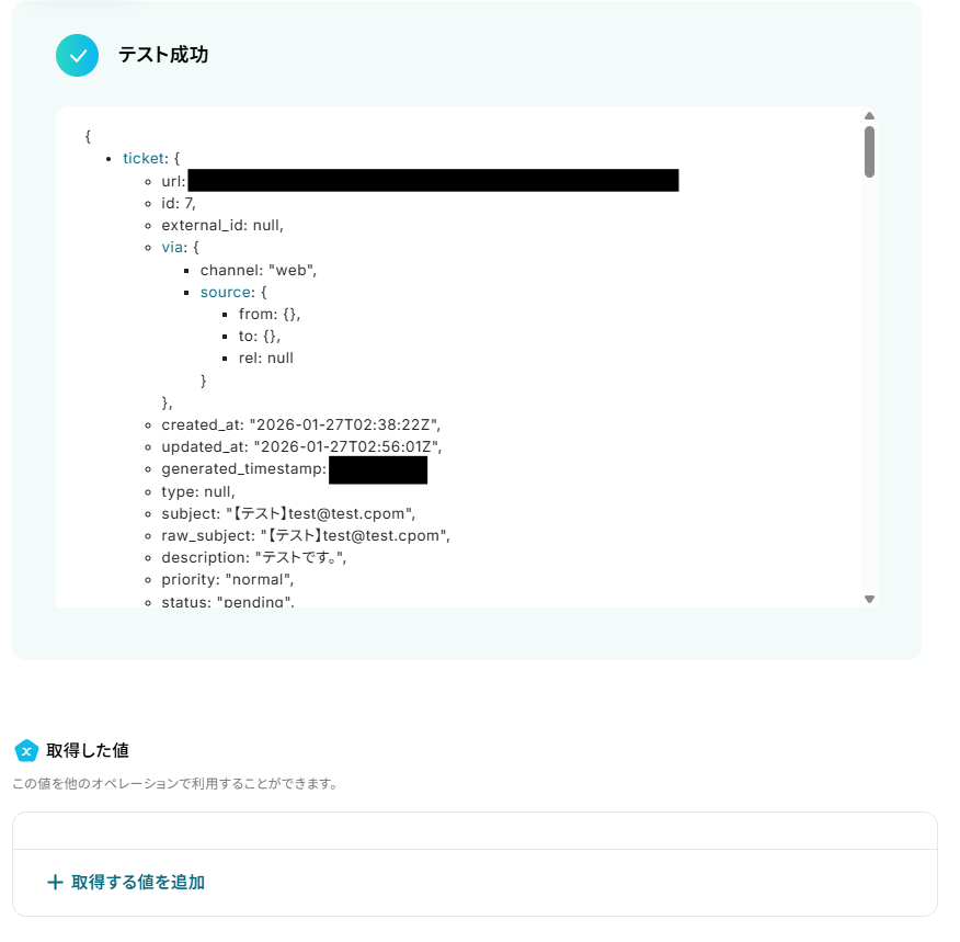 設定できたら「テスト」を行いましょう。 テストに成功すると「取得した値」に反映されます。 「完了」を選択しましょう。