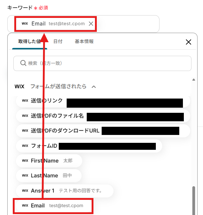 「キーワード」を「取得した値」を使って設定しましょう。 取得した値は変数となります。固定値ではないため、トリガーが実行されるたびに取得した情報を反映できます。 今回は、Zendeskのチケットの件名にメールアドレスが使用されている場合を想定して以下のように設定しました。