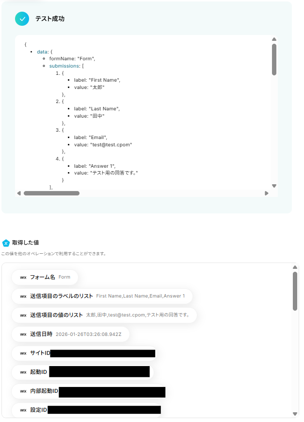 回答を送信できたら、Yoomの画面に戻って「テスト」を行います。 テストに成功すると「取得した値」に反映されます。