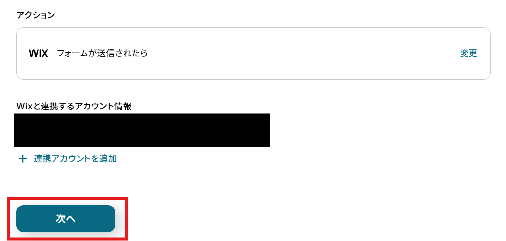 「アクション」はテンプレート通りのままでOKです! 「Wixと連携するアカウント情報」を確認し、「次へ」をクリックして進んでください。