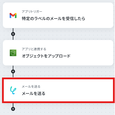 - 最後に、オペレーションでメール機能の「メールを送る」アクションを設定し、担当者へ処理が完了した旨を通知します