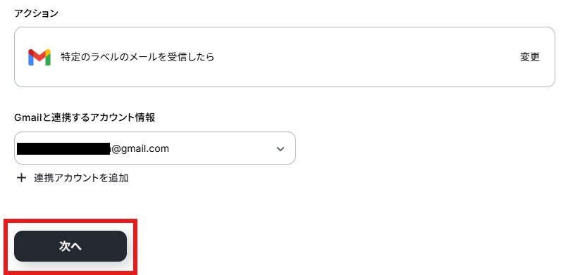 アクションはデフォルト設定のまま、アカウント情報は、連携したいアカウントが選択されているか確認してください。確認出来たら「次へ」をクリックしましょう。