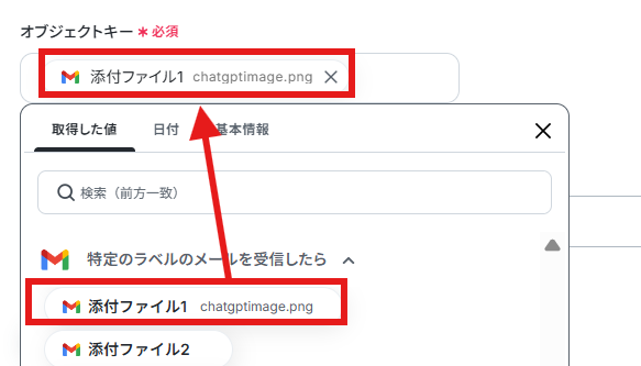 オブジェクトキーは取得した値から「添付ファイル1」を選択しています。