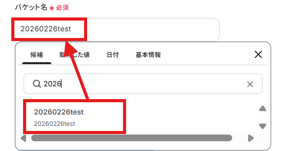 ※アップロード先のバケットを作成していなくても、作成してから再度編集箇所をクリックすると「候補」に表示されます。