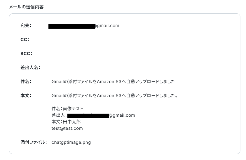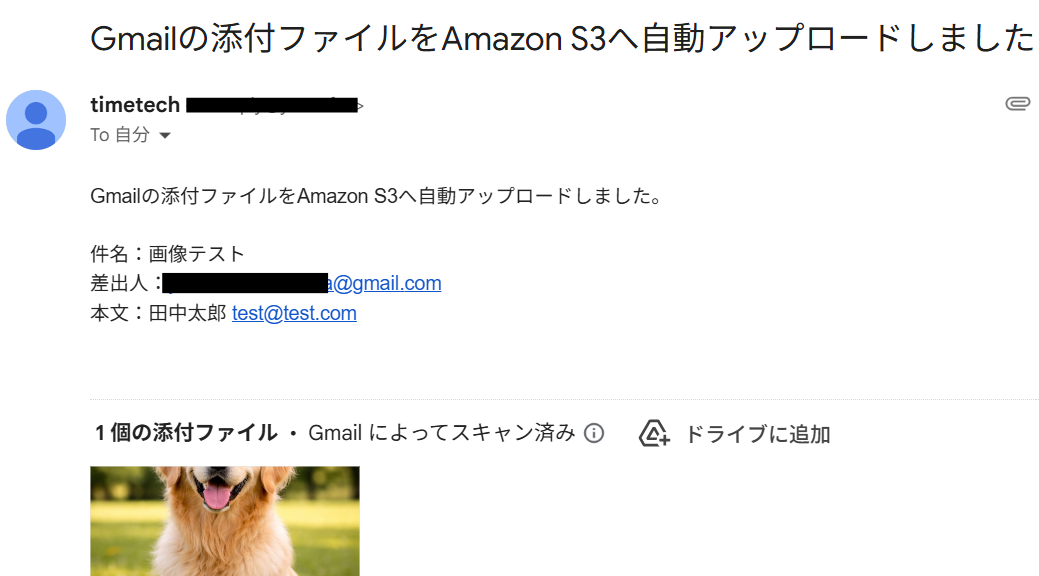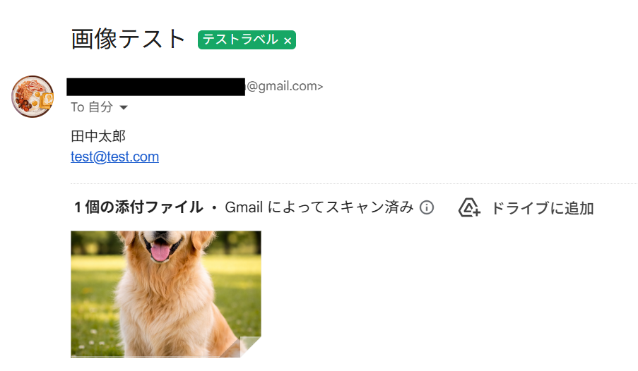 ここでトリガーとして感知させるため、Gmailの該当ラベル宛てにファイル(今回は画像)を添付してメールを送信しておきます。