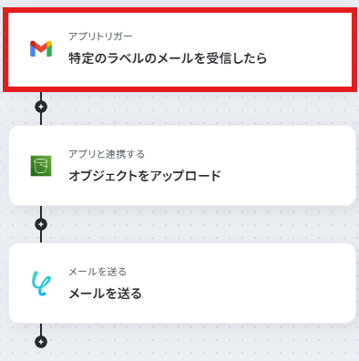 - Gmailのトリガー設定では、「請求書」や「レポート」など、自動化の対象としたいメールに付与するラベルを任意で指定してください