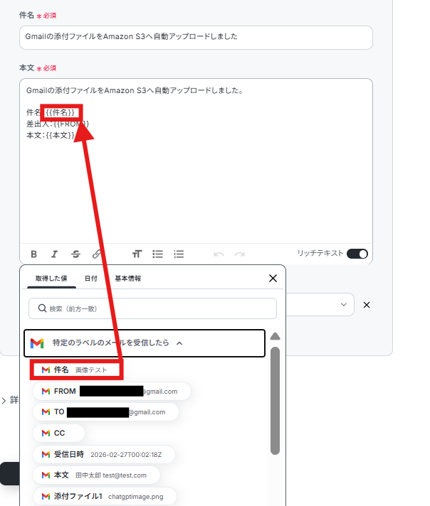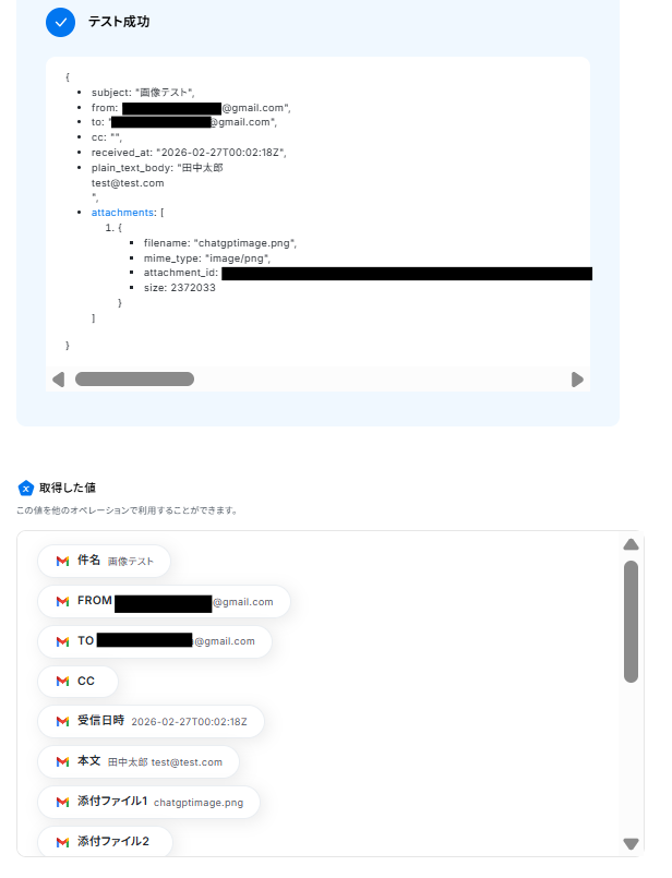 テストが成功し、メールの情報が取得した値に入ればOKです。