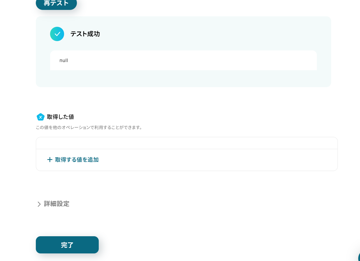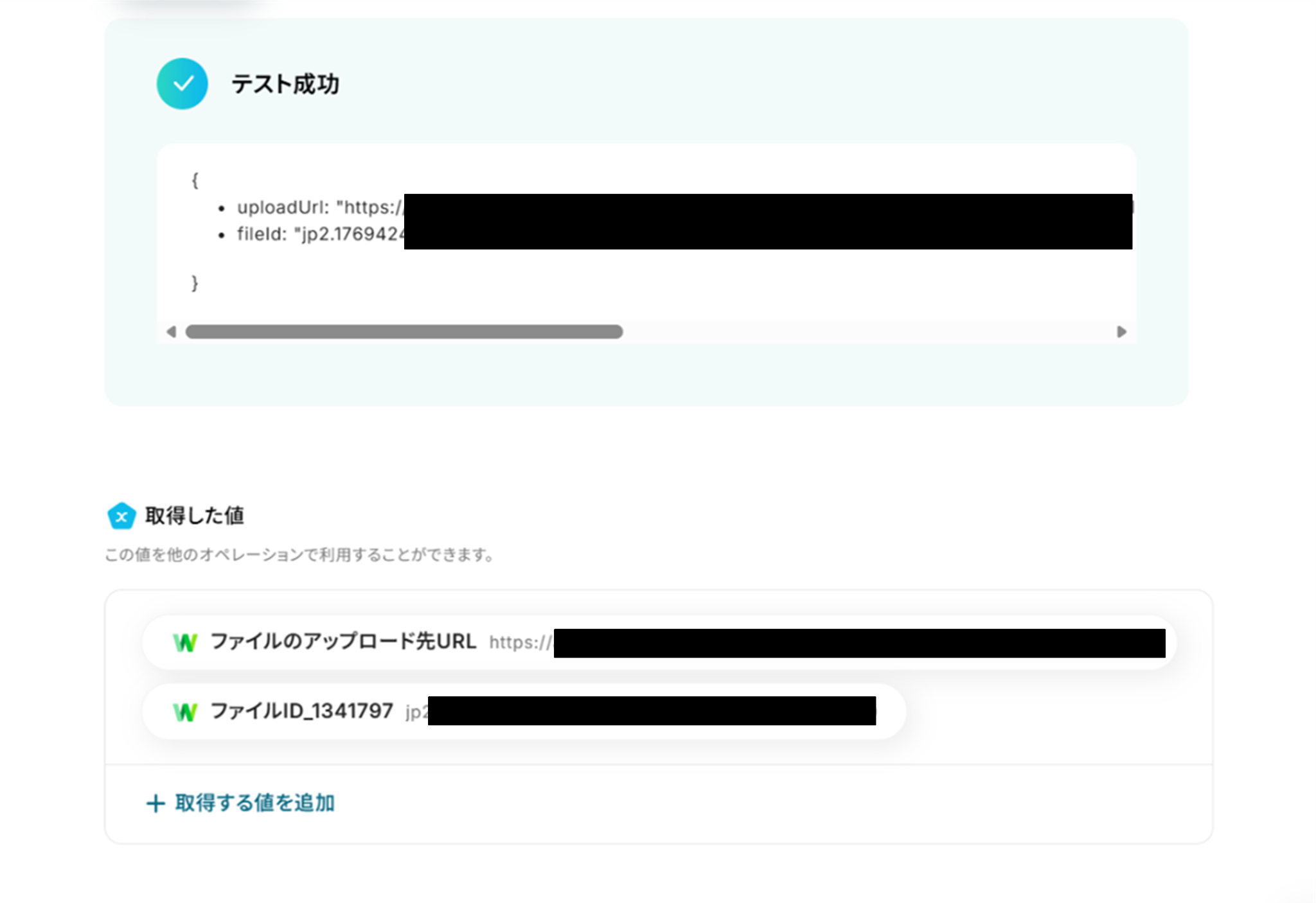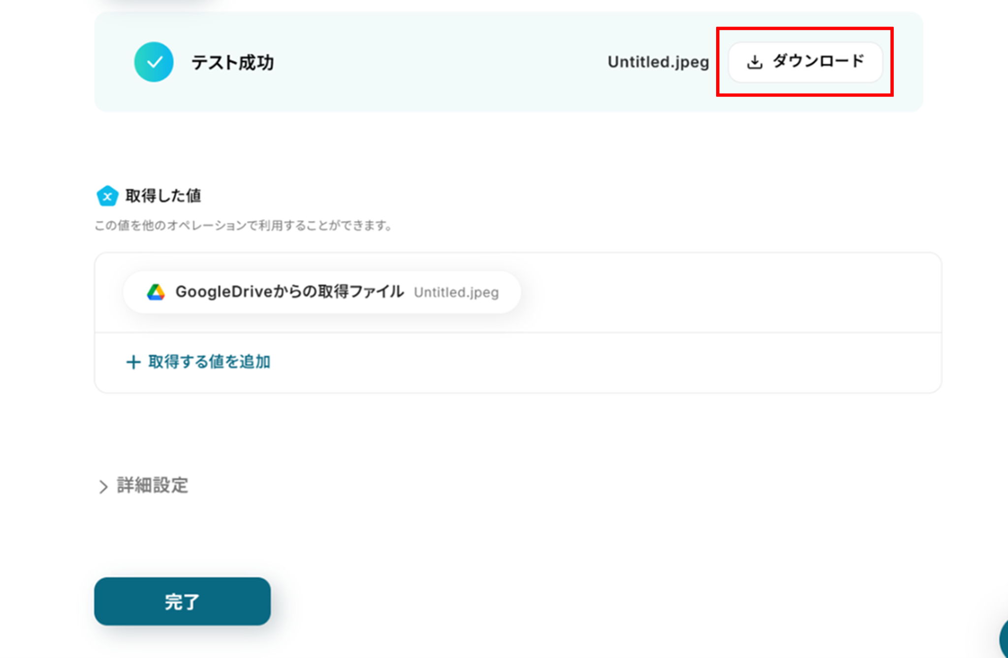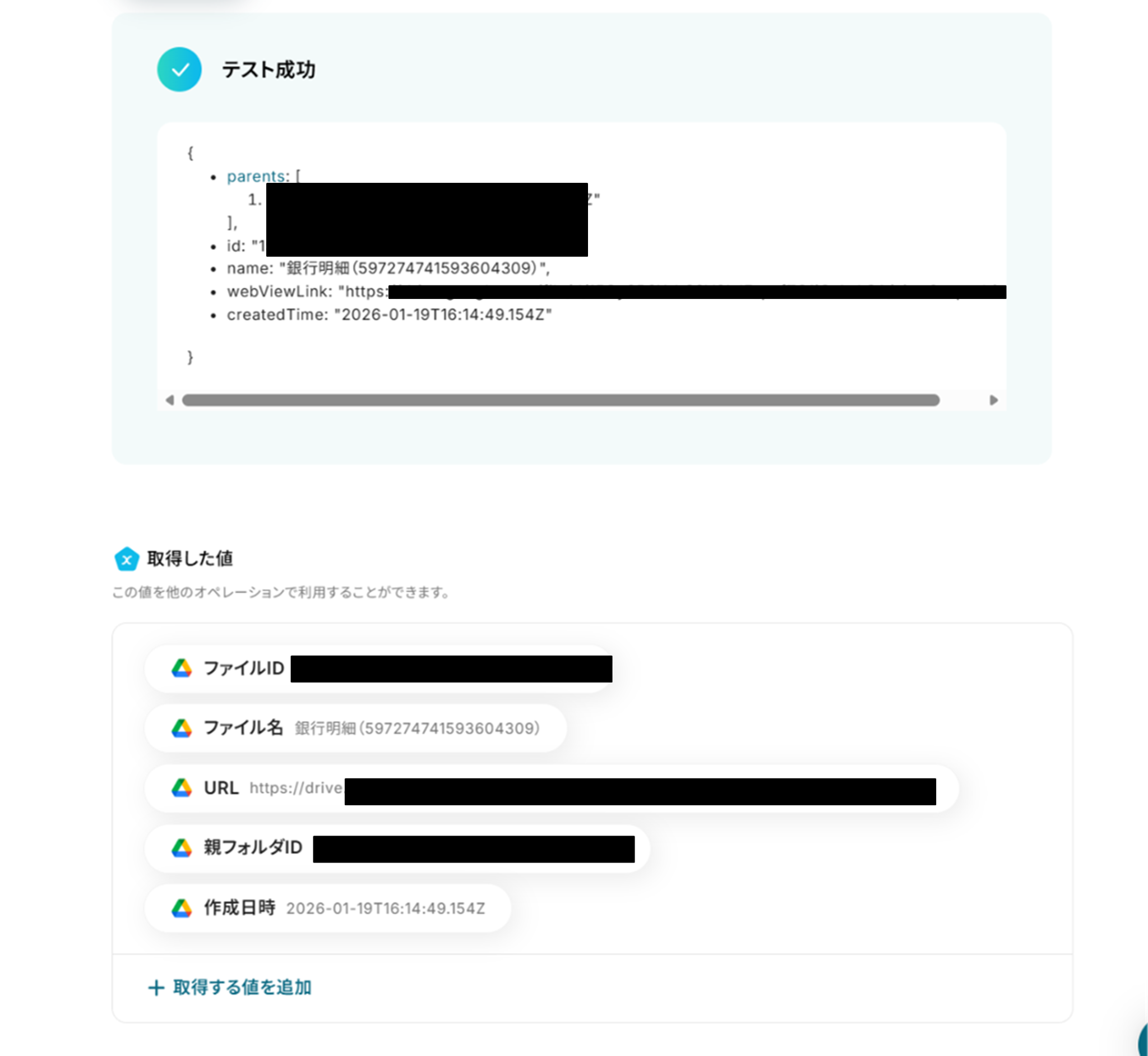 テストに成功すると「取得した値」にGoogle Driveの情報が反映されます。