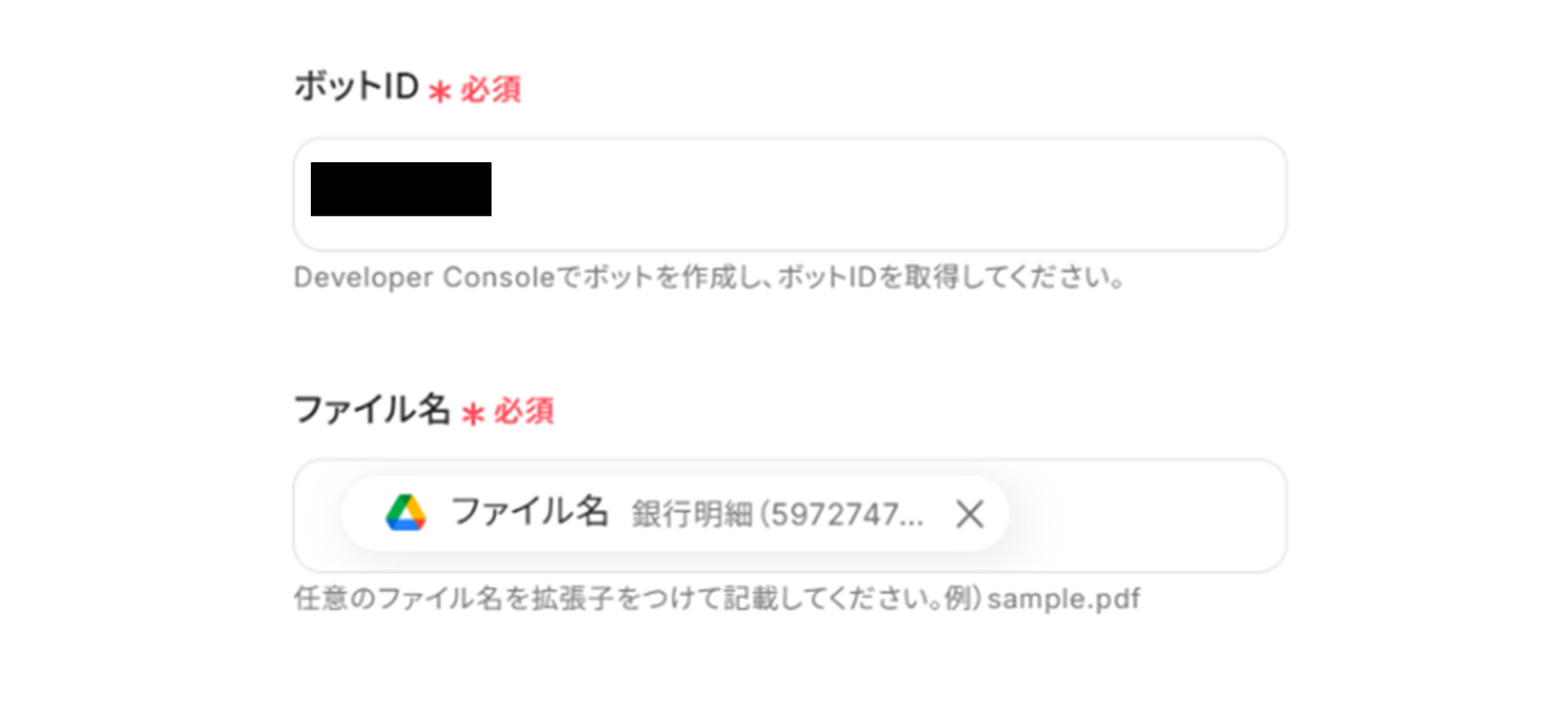 (3)ボットIDは候補から選択し、ファイル名は取得した値を使って入力します。