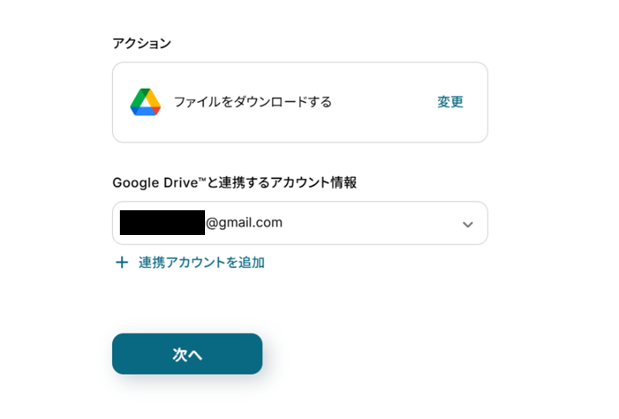 (2)「連携アカウントとアクションを選択」画面から、Google Driveと連携するアカウント情報に誤りがないかを確認し、アクションは「ファイルをダウンロードする」のままで「次へ」をクリックします。